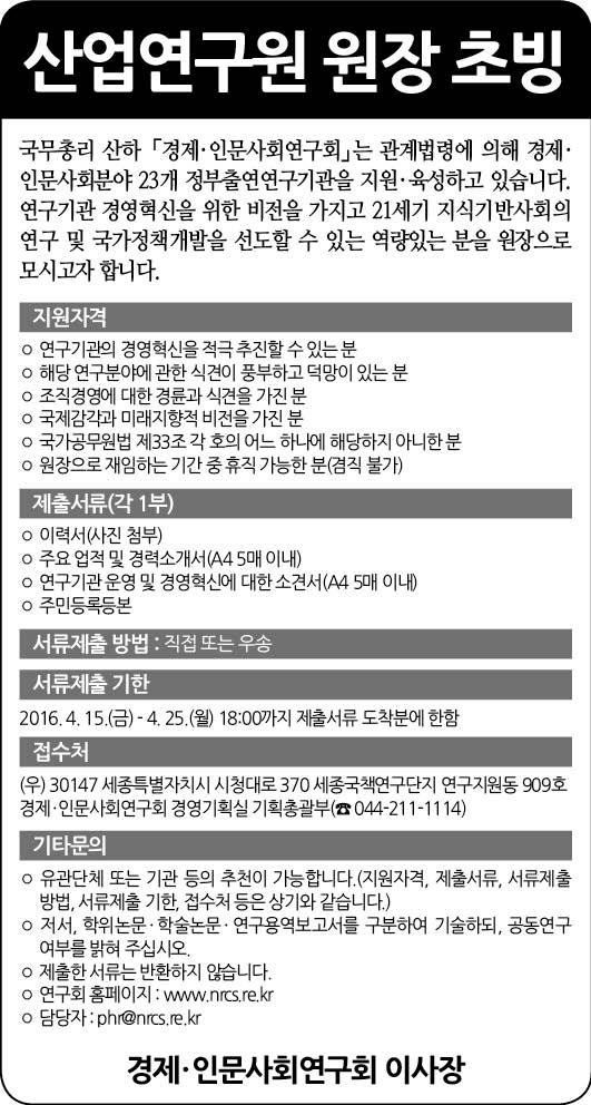 1202 | 일반공지 | 산업연구원 원장 초빙 | 2016/04/15 | ![]() |