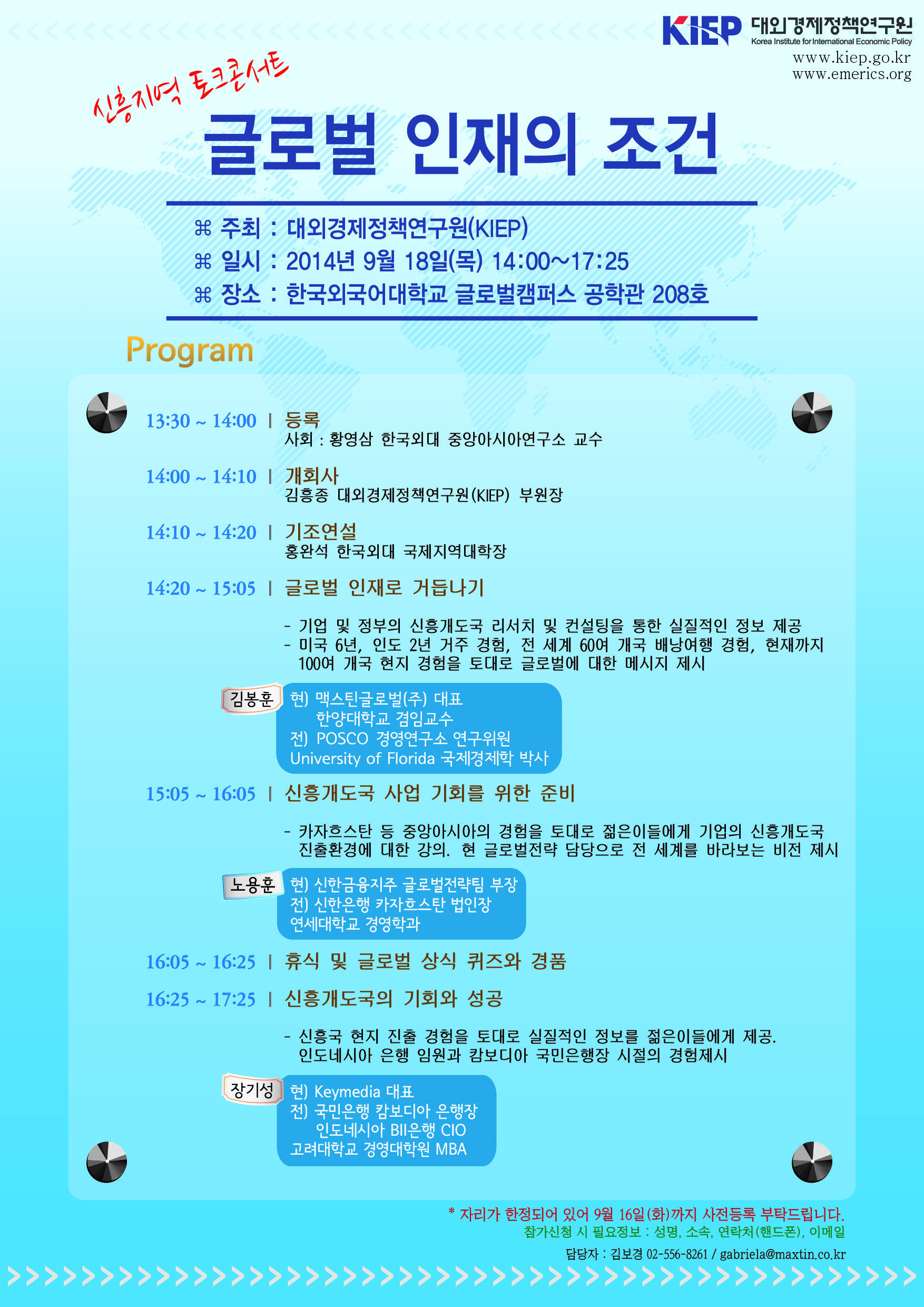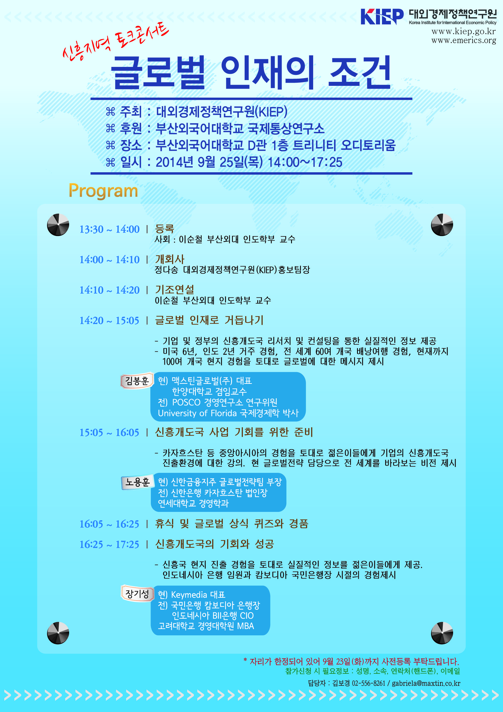 1042 | 일반공지 | [제4차 신흥지역 토크콘서트] 글로벌 인재의 조건 | 2014/09/03 | ![]() |