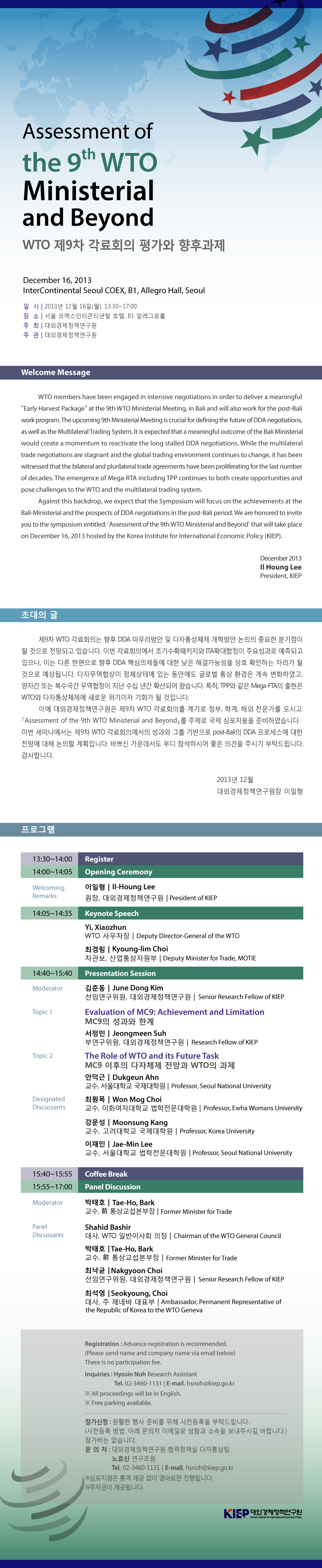952 | 일반공지 | [세미나] WTO 제9차 각료회의 평가와 향후과제 심포지엄 | 2013/12/04 | ![]() |