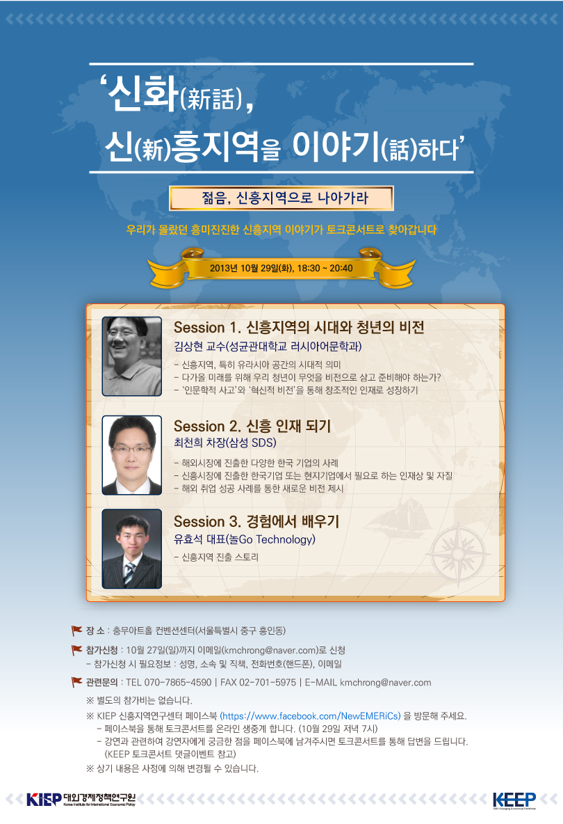 931 | 일반공지 | [KEEP 프로젝트 토크콘서트] 신화(新話), 신(新)흥지역을 이야기(話)하다 | 2013/10/15 | ![]() |