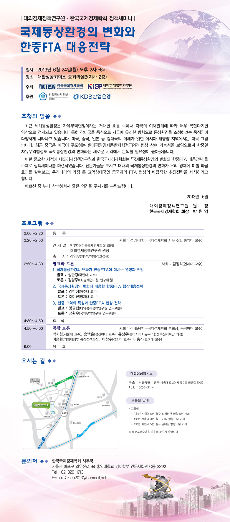 889 | 일반공지 | [세미나] 국제통상환경의 변화와 한중 FTA 대응전략 정책세미나 | 2013/06/18 | ![]() |