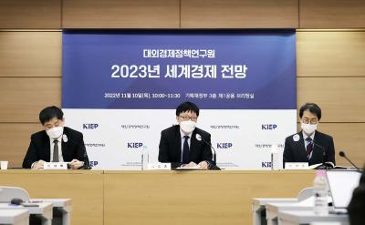 2023년 세계경제 전망 발표 기자간담회 개최대외경제정책연구원(KIEP)은 11월 10일(목) 정부세종청사 기획재정부 3층 브리핑실에서 기획재정부 출입 기자들을 대상으로 ‘2023년 세계경제 전망' 발표 기자간담회를 개최했다. 정부포탈 e-브리핑을 통해 온라인 생중계된 이번 간담회는 내년 세계경제 성장률을 전망하고 관련 세계경제 현안에 대해 질의응답 하는 자리였다.김흥종 KIEP 원장은 모두발언을 통해 내년 세계경제는 2.4% 성장할 것으로 전망했다. 해당 전망치는 KIEP가 지난 5월 제시한 전망치 3.6%에 비해 1.2%p 하향 조정된 전망치이다. 김흥종 원장은 세계경제 성장의 키워드로 “긴축과 파편화 속에 억눌린 회복”을 꼽았으며, 인플레이션에 따른 통화 긴축과 이에 따른 재정 부담, 대 러시아 경제 제재 외에도 미중 전략 경쟁이 불러오는 글로벌 공급망의 파편화가 세계경제 성장의 발목을 잡을 것이라고 설명했다. 전망 개관을 브리핑한 안성배 국제거시금융실장은 긴축과 파편화 속에 경기회복이 억눌린 가운데, 금리 급상승과 민간 부채 부담의 실물 전이, 재정 역할의 딜레마, 러시아-우크라이나 사태, 미중 전략경쟁 등의 지정학적 리스크는 세계경제 성장의 추가적인 하방 요인으로 작용할 것이라고 설명했다. 이어, 선진국의 경우, 미국과 유로, 영국 등 주요국들이 모두 매우 낮은 성장세를 보일 것으로 전망했으며, 주요 신흥국인 중국, 인도, 러시아, 브라질 등은 대외환경 악화로 지난 2022년 5월 대비 하향 조정된 전망 수치를 발표했다. 이번 기자간담회에는 KIEP 김흥종 원장, 정성춘 부원장, 이권형 세계지역연구센터 소장, 권율 국제개발협력센터 소장, 안성배 국제거시금융실장, 김종덕 무역통상실장, 곽성일 경제안보실장 및 관련 원내 연구진과 기획재정부 출입 기자들이 참석했다.- 행사명: 2023년 세계경제 전망 발표 기자간담회 개최- 주 제: 2023년 세계경제 전망- 일 시: 2022년 11월 10일(목), 10:00~11:30- 장 소: 정부세종청사 기획재정부 3층 제1공용 브리핑실/ e-브리핑 동시 진행* 2023년 세계경제 전망 보고서 다운로드작성자 기관담당자 작성일 2022/11/10 조회수 2,892